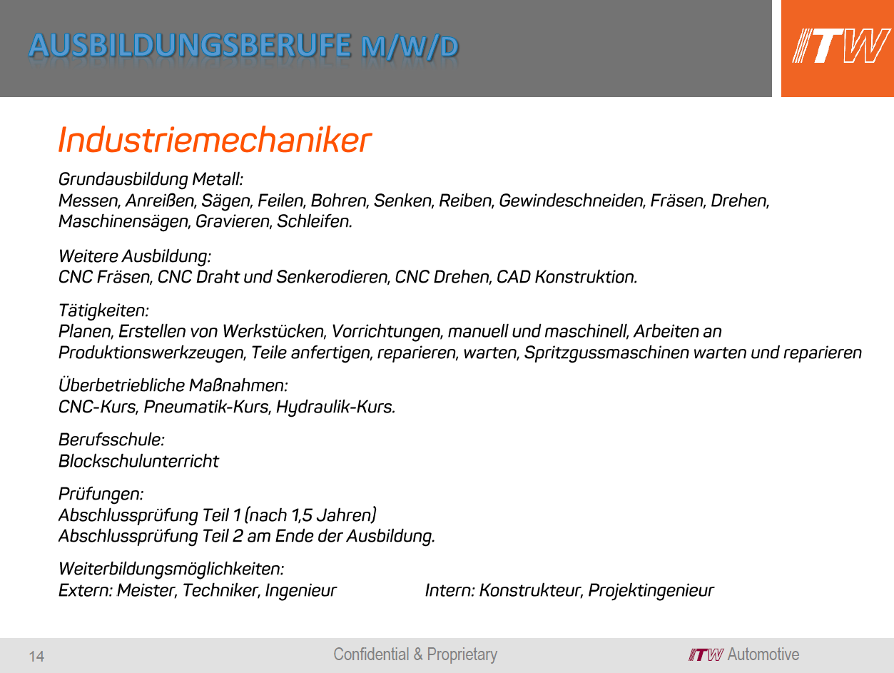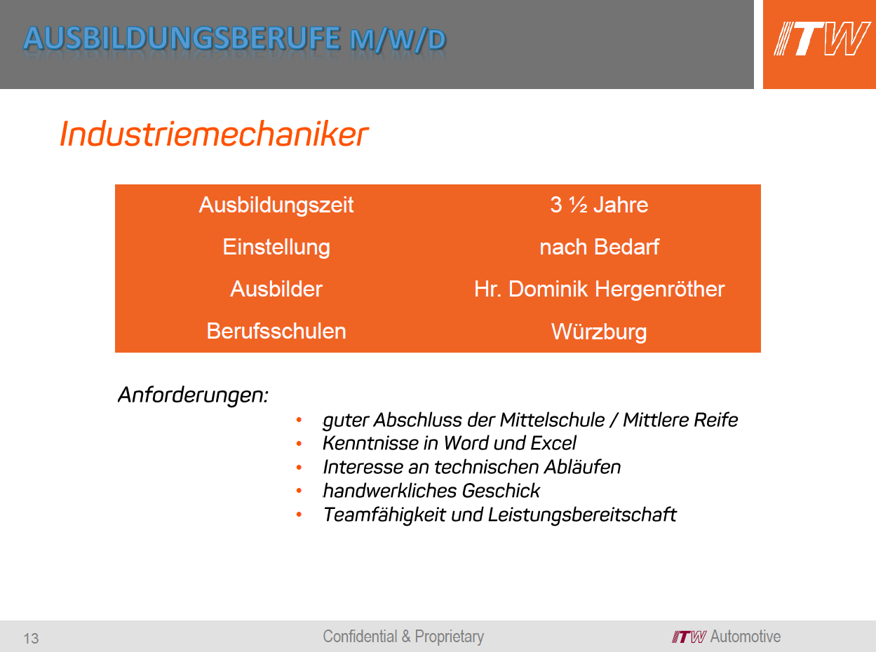 Mechatroniker m/w/d ITW Automotive Products GmbH / ITW Motion 97285 Röttingen Gymnasium/FOS/BOS, Realschule, Mittelschule Ausbildung möglich |